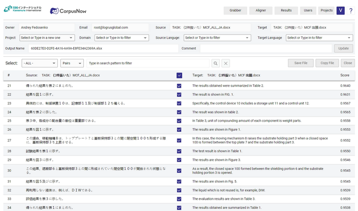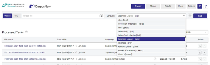 CORPUSNOW, a part of the Kawamura Cloud solutions, brings the state-of-the-art technologies to the preparation and processing of parallel texts in order to create bilingual output, such as translation memory files and linguistic training data for machine translation engines. CorpusNow uses the most advanced AI models to align translation pairs in any combination of 110 languages from unstructured and unordered streams of content, including documents that may be only vaguely related. It almost magically captures the linguistic similarities among sentences in different languages and creates nearly perfect alignment, ranged by similarity score.
